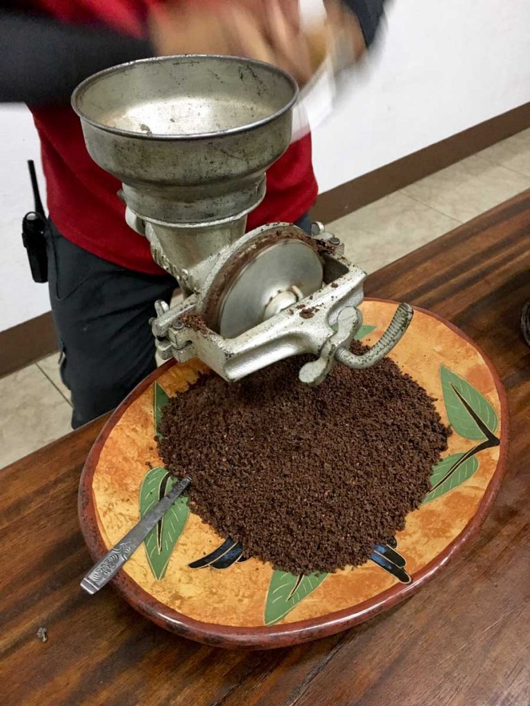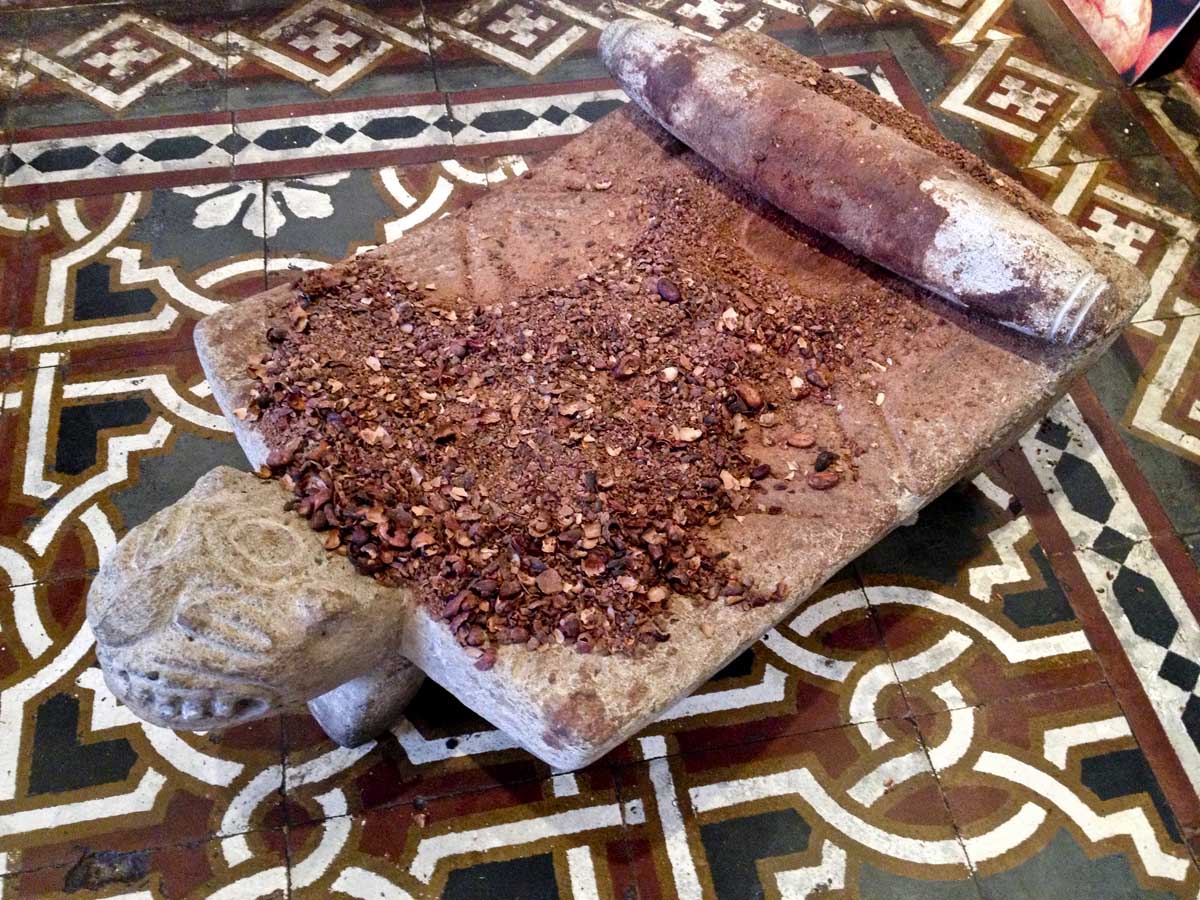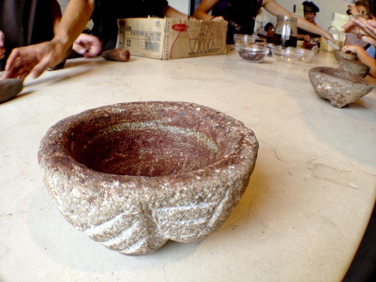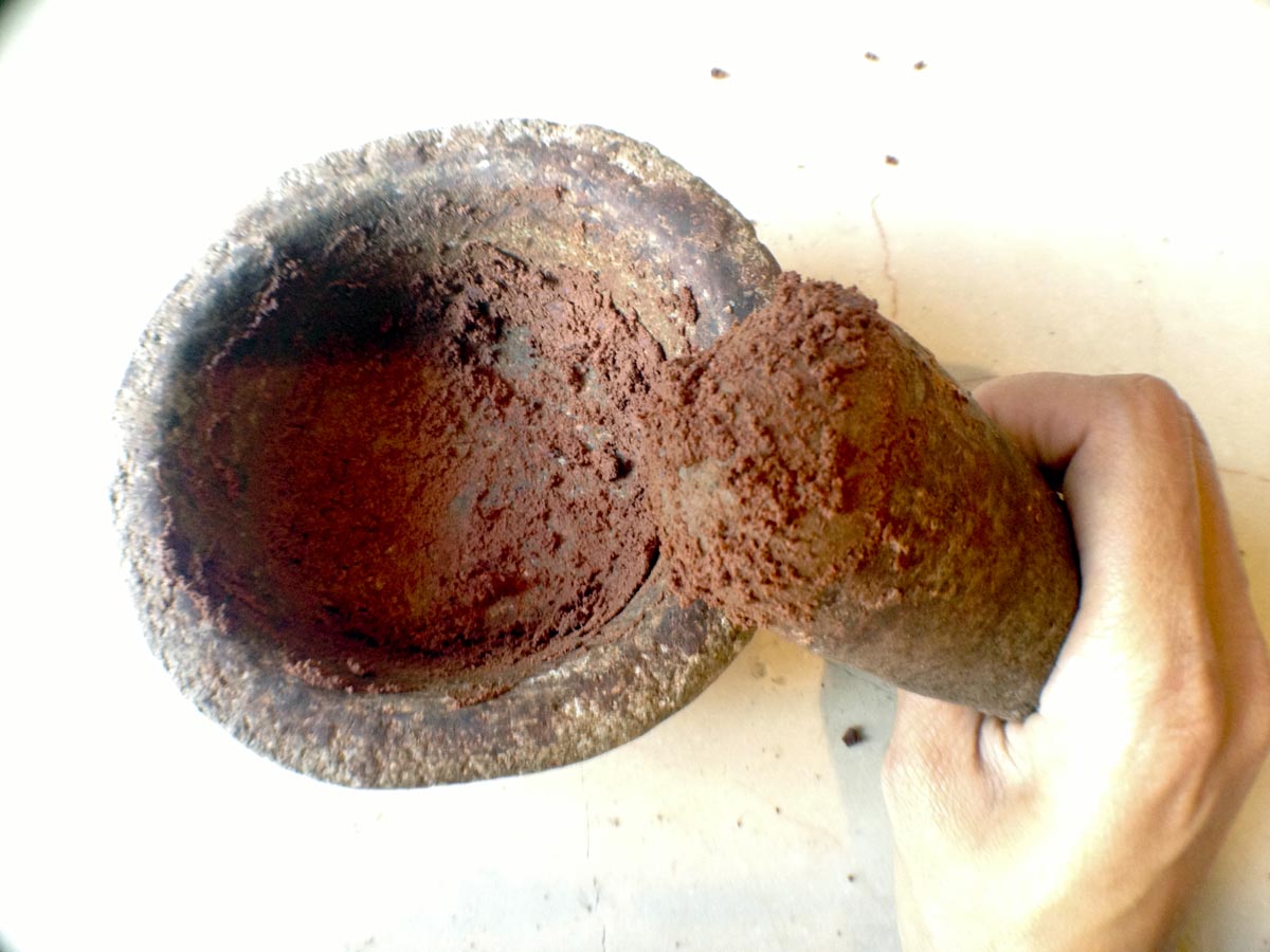 Kabukları tezgahtan süpürüp taneleri kenara ayırdıktan sonra sıra çekirdekleri öğütmeye geldi. Kollara kuvvet! Mayalar zamanında öğütme düz bölümüne metate ve silindirik oklavasına mano denen bir değirmen taşıyla yapılıyormuş. Eski bir örneği müzede de bulunan taşın başına diz çöken Alejandro bir parça çekirdeği elde öğütüverdi. Epey kas kuvveti gerektiren bu işlemi, bir çuval çekirdek için saatler boyunca yapmanın yoruculuğunu tahmin edersiniz.