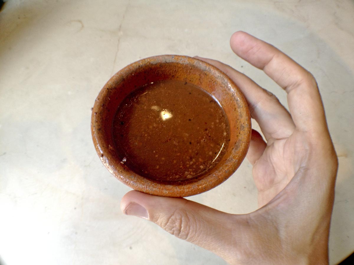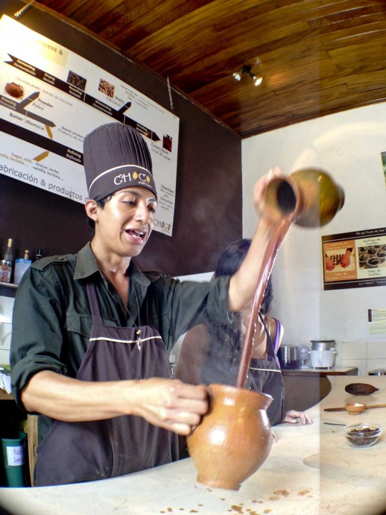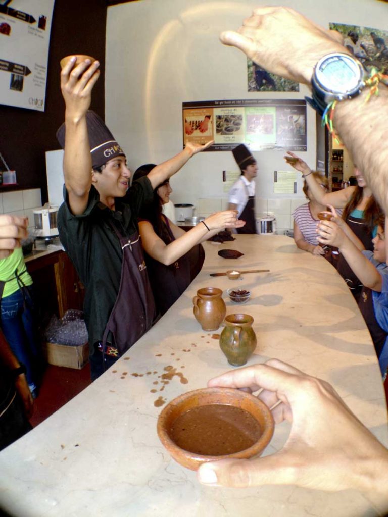 Alejandro’nun anlattıklarını can kulağıyla dinledikten sonra bir elimde toprak sürahi, diğer elimde toprak fincan, sıcak sıvıyı oradan oraya döküp duruyorum. Benimki aman aman köpürmüyor, ancak içilecek kadar soğuduğuna kanaat getirince aktarma işine son veriyorum. Çili biberini de elimi korkak alıştırmadan serpiştirip hızlı hızlı karıştırıyorum. Fincanlarımızı tokuşturup hepimiz ‘çikolatamızdan’ merakla birer yudum alıyoruz.