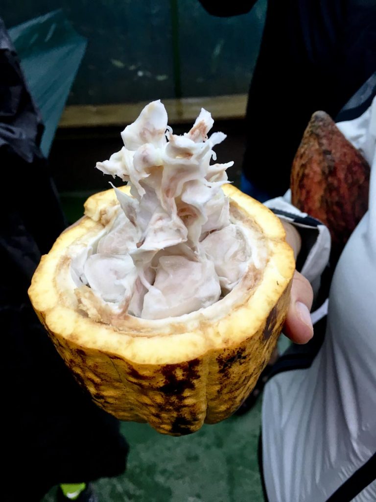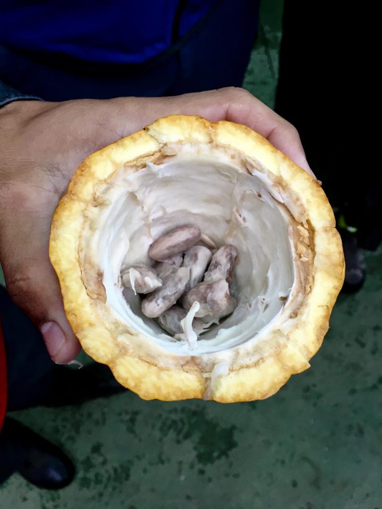 İçeriyi baştan başa sarmış, yoğunluğuyla sersemleten, hatta burnumuzu bir miktar felç eden o tatlı kokudan dikkatimizi zar zor çevirdiğimiz genç rehberimiz, çikolatayı pakedinden başka yerde görmemiş biz şehir insanları için giriş dersinde önce tanımları yerli yerine oturttu: Önümüze bütün bir kakao meyvesi, bir avuç kakao çekirdeği, biraz kakao macunu, bir çimdik kakao tozu, bir küçük kalıp kakao yağı, birkaç çikolata tableti dizdi. Ve hangisinin hangisi olduğunu bildiğimizden emin oldu.