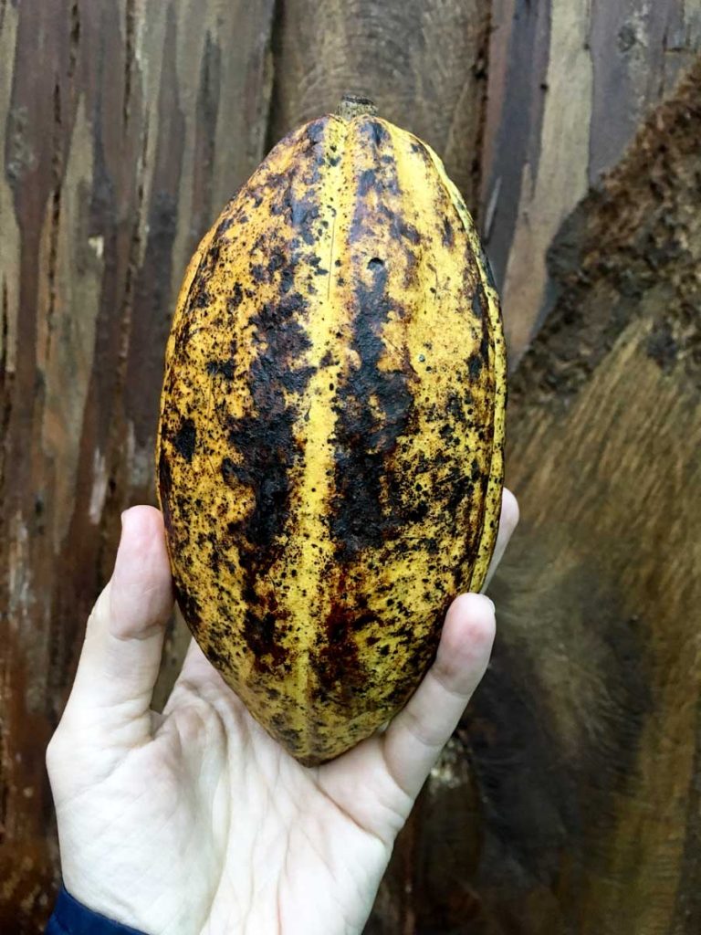 Şekli gerçekten kavunu andıran, turuncu veya pembe renkli kakao meyvesinin sert kabuğunu yarıp içine bakarsanız beyaz, sümüksü bir jöle bulursunuz. Görüntüsü pek hoş değildir belki, fakat kokusu şekerli ve iştah açıcıdır bu jölenin. Badem büyüklüğündeki kakao çekirdekleri bu beyaz dokunun içine gömülüdür. Her meyvenin içinde yaklaşık 40 adet çekirdek bulunur. Çekirdekleri jölenin içinden sıyırıp çıkarmalısınız. Çikolata yapımı diye adlandırılan eylem, çıkardığınız bu çekirdekleri macun kıvamına getirmektir.