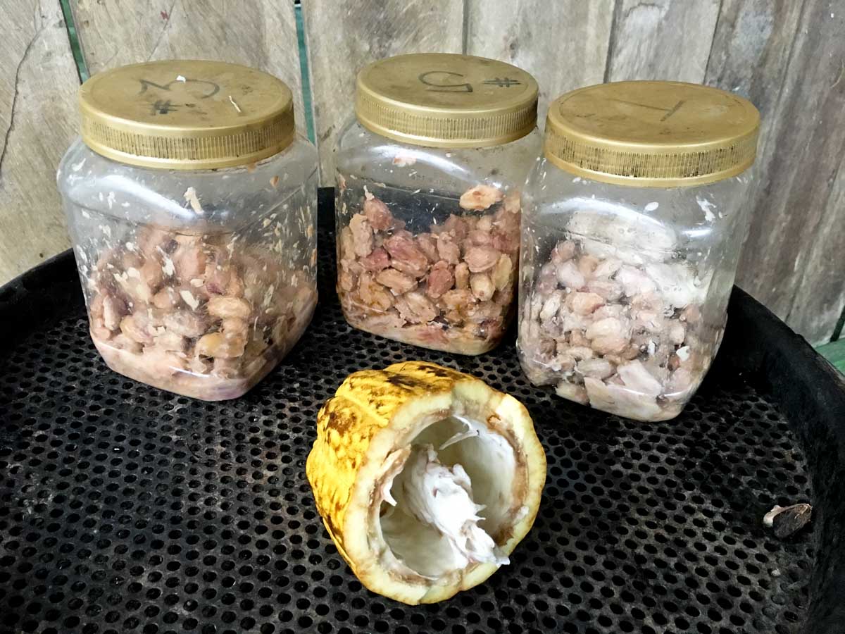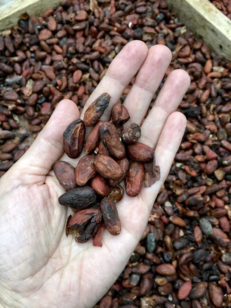 Meyveleri yardık ve elimizi o sümüksü jöleye daldırıp çekirdekleri tek tek ayıkladık. Ben meyvenin o tatlı, sıvışık özüne bulanmış parmaklarımı yalasam mı diye düşünürken Alejandro tezgahın altından önceden fermente edilmiş ve ardından güneş yerine daha kısa sürede fırında kurutulmuş kakao çekirdekleriyle dolu bir torba çıkardı. Çikolatamızı yapmaya devam edebilmek için, yaklaşık bir hafta süren birinci ve ikinci adımları masum bir hileyle atlamamız gerekiyordu.